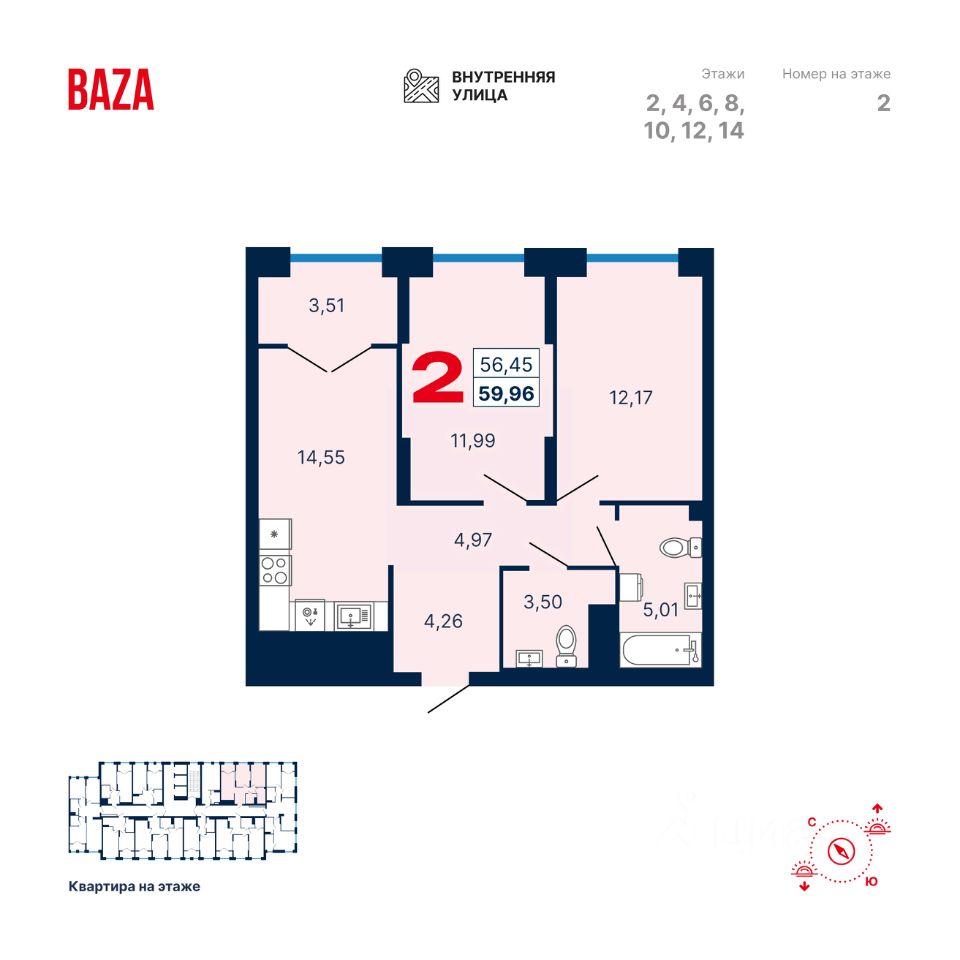 Продаётся квартира в ЖК ''Тёплые кварталы''. 2-комнатная квартира, 59,96 м², 438, Очередь 3, дом 2. Стоимость указана с учетом чистовой отделки.