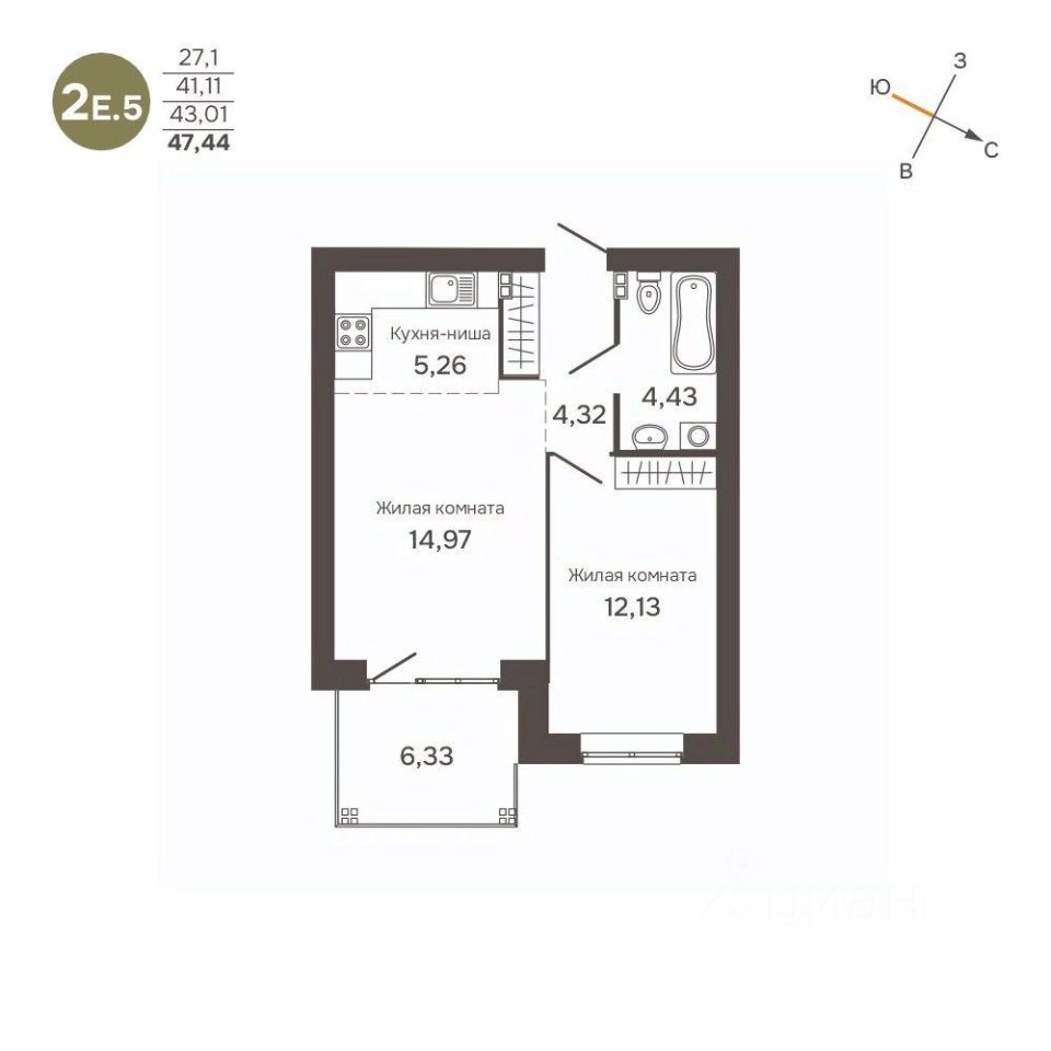 Общая площадь43,01 м2