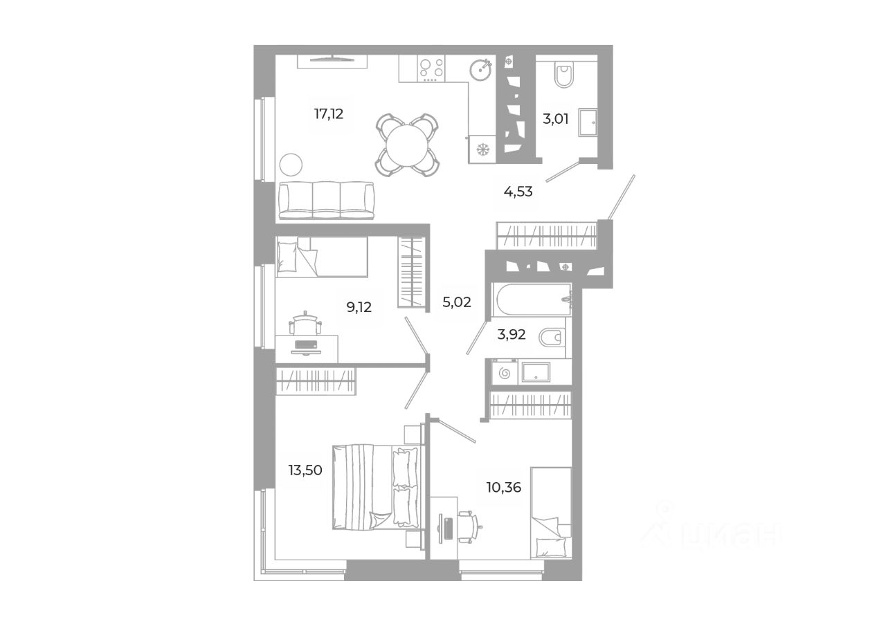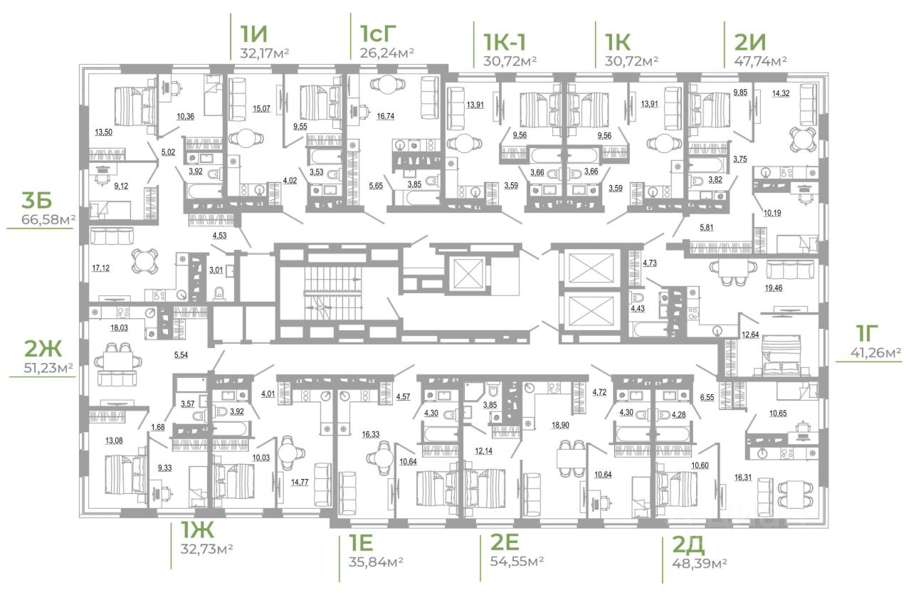 - Кладовые помещения на каждом этаже и на -1 этаже. В проекте 25 планировочных решений: от уютных студий от 21,51 м² до квартир с тремя спальнями и кухней-гостиной до 66,58 м² с функциональным разделением на гостевую и приватные зоны.