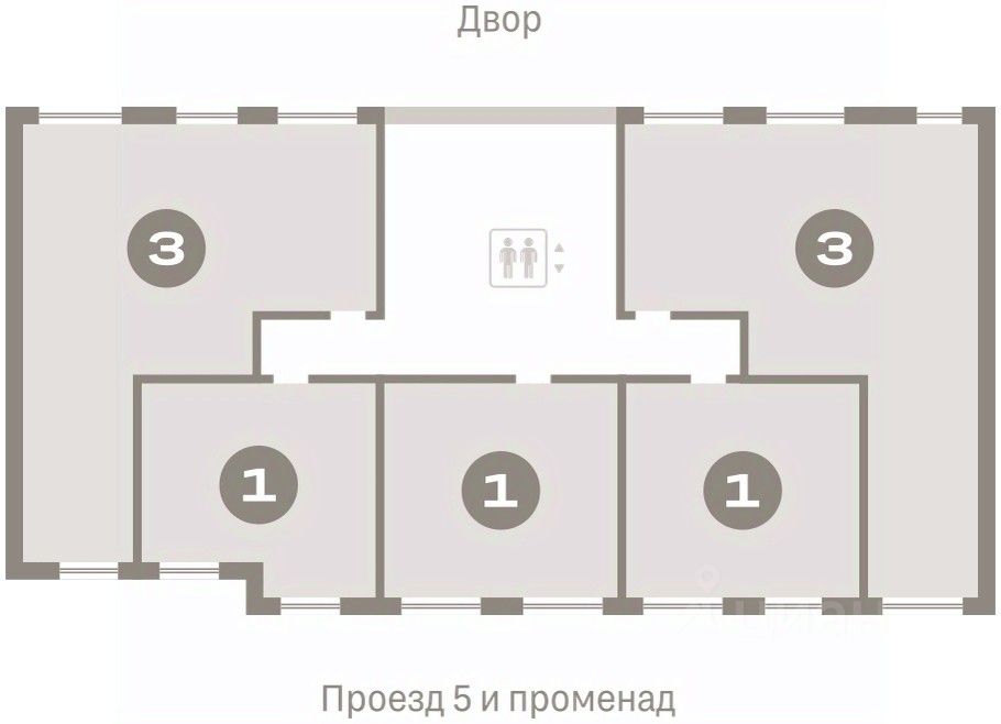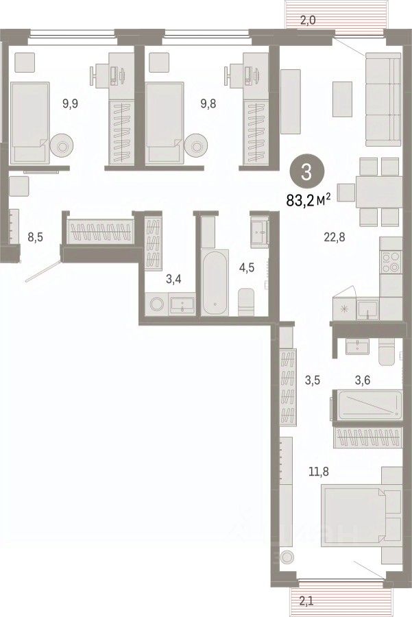 Квартира с кухней-гостиной и тремя спальнями в Бруснике в Академическом. Особенности планировки: гардеробная, вид во двор, разнесённые спальни, предчистовая отделка, мастер-спальня, постирочная, балкон. квартиры в нашей базе: АКД4-ГП4-4-4.3.1.
