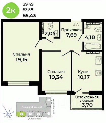Общая площадь55,43 м2