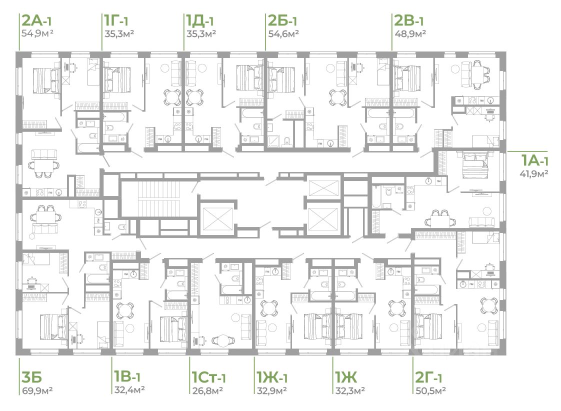 В комплексе представлены десятки планировок с площадью квартир от 26,24 м² до 66,58 м². Каждая учитывает сценарии жизни, эргономичность и функциональность каждого квадратного метра. Для тех, кто ценит загородный формат жизни в спокойствии, но хочет оставаться в центре города, хорошим вариантом станут квартиры с террасами. Они расположены по четырём сторонам домов, а это значит, что из них открываются панорамные виды на 180 градусов с обзором на город и квартал. На террасах приятно проводить вечера, работать с комфортом, любуясь восходами и закатами, тренироваться или отдыхать.