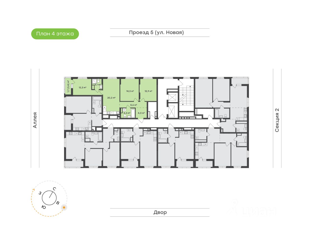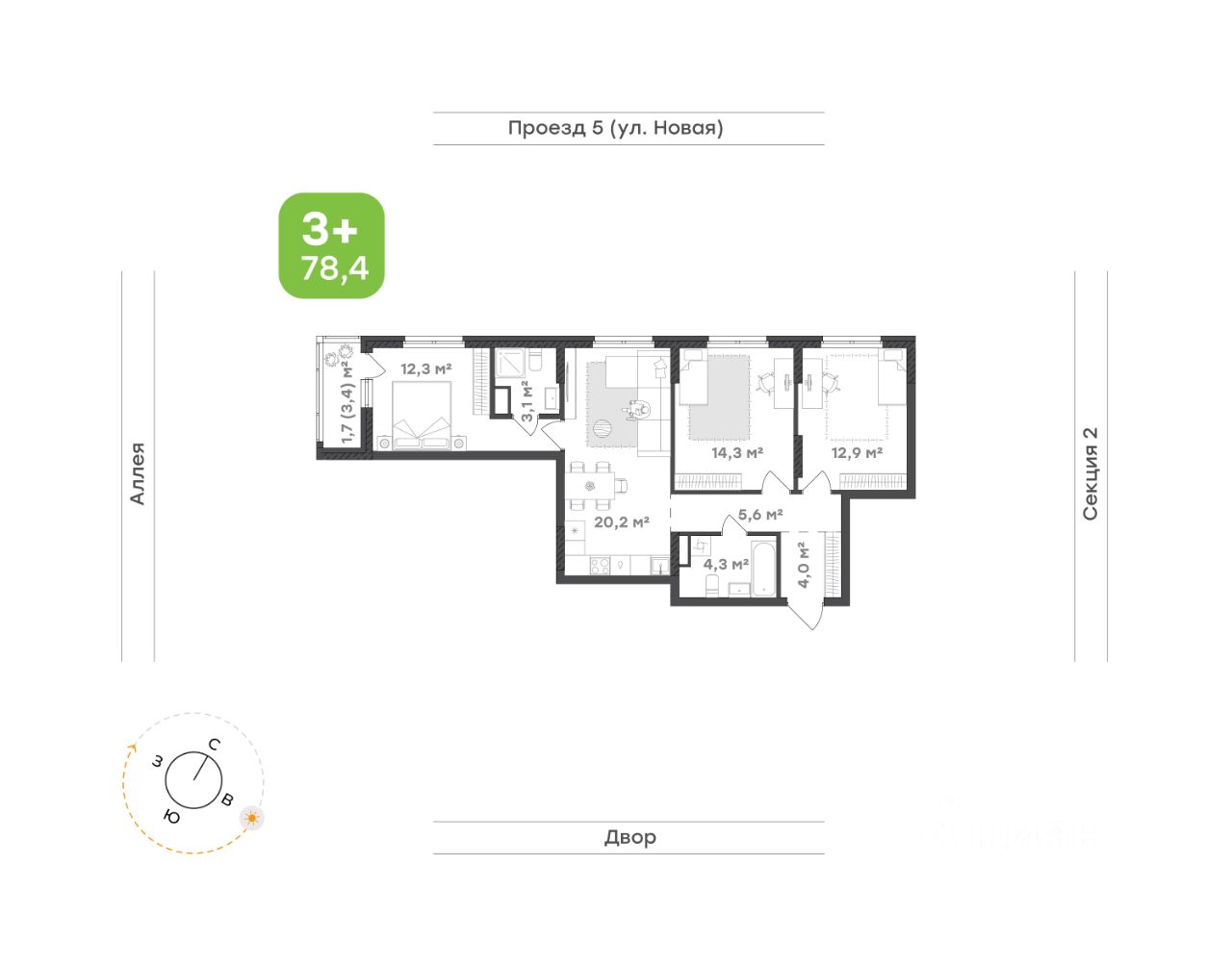 Квартира для семьи, ценящей комфорт и личное пространство Мастер-спальня 12,3 м² — уединённое пространство с личным санузлом 3,1 м², удобным местом для хранения и выходом на панорамную лоджию. Здесь можно просыпаться с видом на аллею, наслаждаясь утренним светом и свежим воздухом Мастер-спальня отделена от жилой зоны просторной кухней-гостиной 20,2 м² — центра квартиры, где удобно собираться всей семьёй по вечерам, устраивать ужины и тёплые посиделки с друзьями. Открытое пространство создаёт ощущение свободы и лёгкости Две спальни 14,3 м² и 12,9 м² подойдут для детей, гостей или рабочего кабинета. Светлые, просторные и уютные — они легко адаптируются под любые задачи Коридор 5,6 м² связывает все комнаты, обеспечивая удобную навигацию и создавая ощущение целостности пространства Прихожая 4,0 м² —компактная и продуманная. Здесь предусмотрено удобное место для хранения, которое поможет избежать загромождённости и сохранить порядок Санузел 4,3 м² с ванной и выделенным местом под стиральную машину сделает утренни