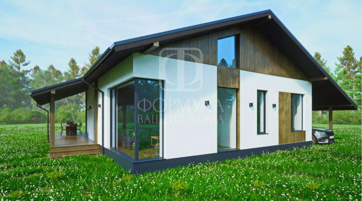 В доме: 3 спальни (одна из них мастер-спальня с отдельным санузлом и гардеробной) Кухня-гостиная с выходом на террасу Санузел Гардеробная Котельная Навес для машины