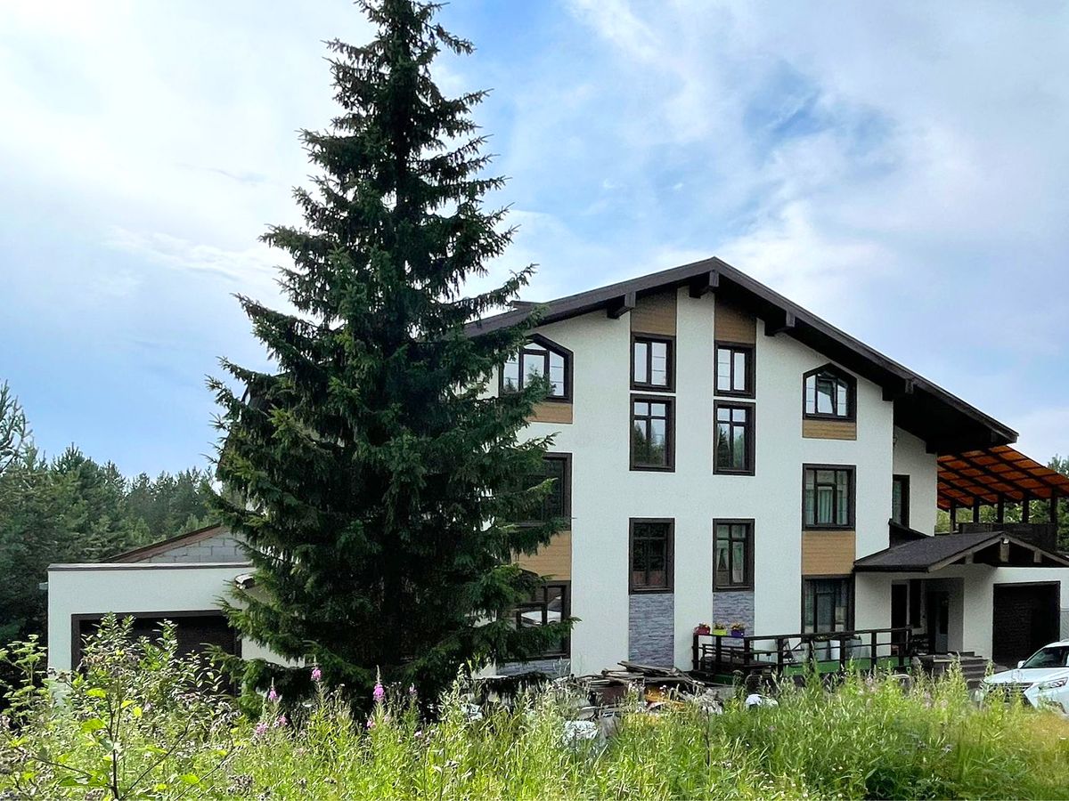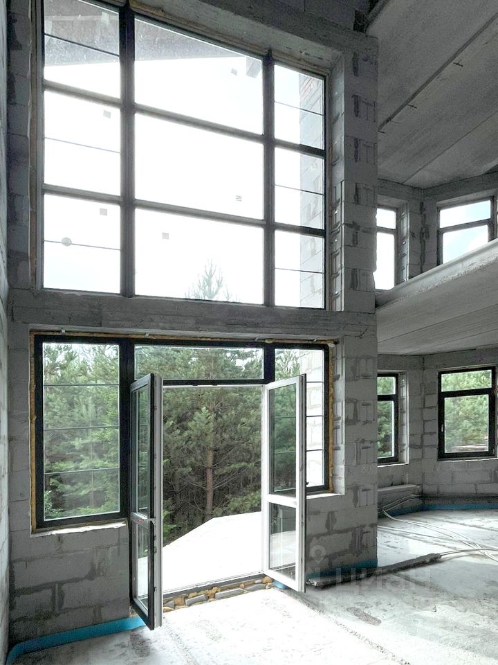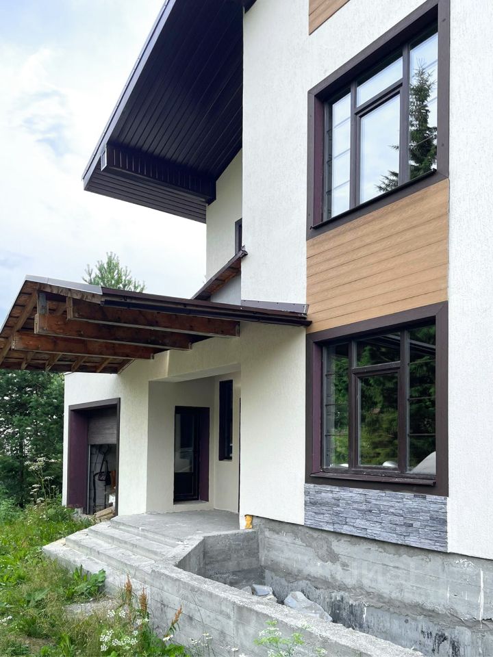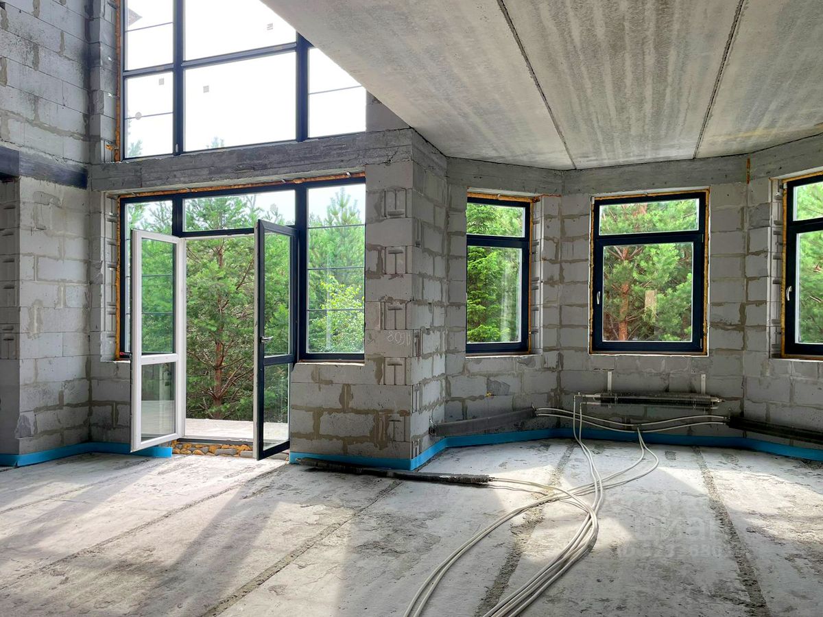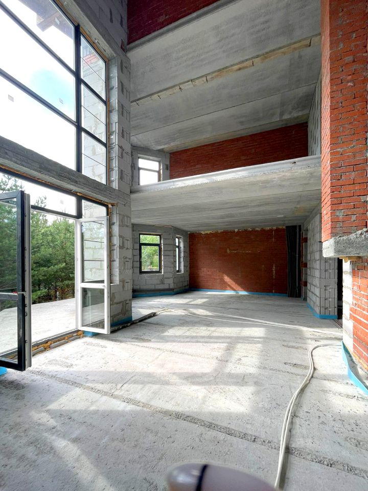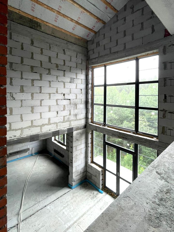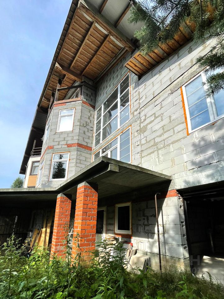 Участок и дом по кадастру разделен на 2 части. Часть продаваемого участка 24 сотки, площадь продаваемого дома (половины блокированного здания) 387,76 м.кв. 2 больших террасы на 1-ом и 2-ом этажах, балкон на 3-ем этаже с великолепным видом на лес. На половине участка естественный дикий сосново-березовый живописный лес. Строительство дома завершено в 2017 году. Дом сдан в эксплуатацию.