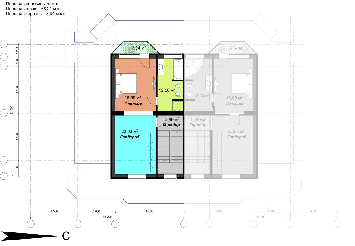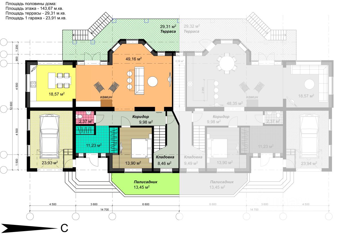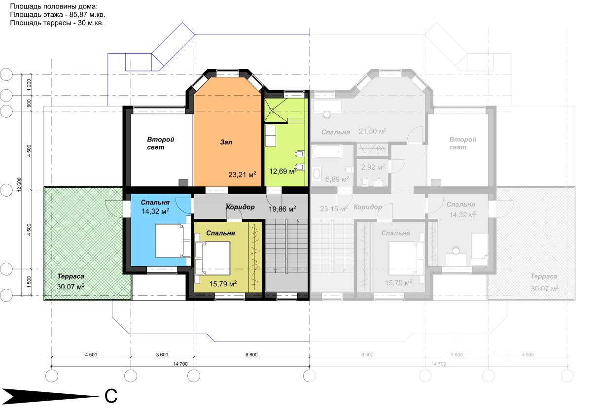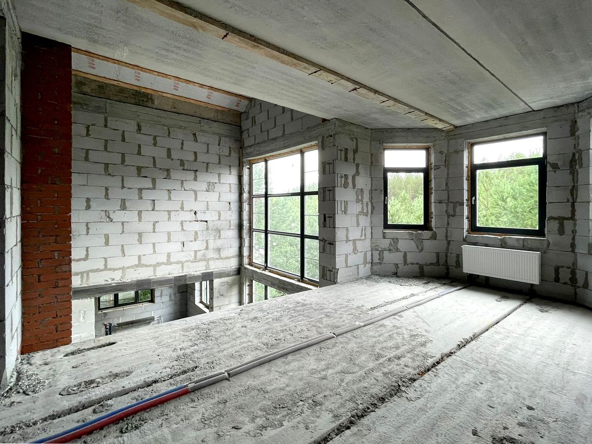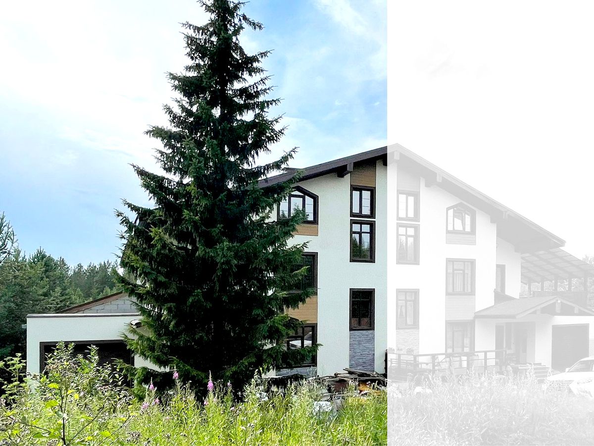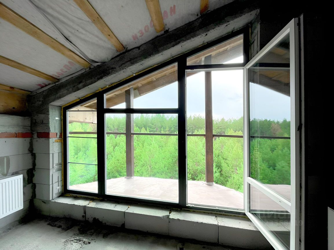 Участок и дом по кадастру разделен на 2 части. Часть продаваемого участка 24 сотки, площадь продаваемого дома (половины блокированного здания) 387,76 м.кв. 2 больших террасы на 1-ом и 2-ом этажах, балкон на 3-ем этаже с великолепным видом на лес. На половине участка естественный дикий сосново-березовый живописный лес. Строительство дома завершено в 2017 году. Дом сдан в эксплуатацию.