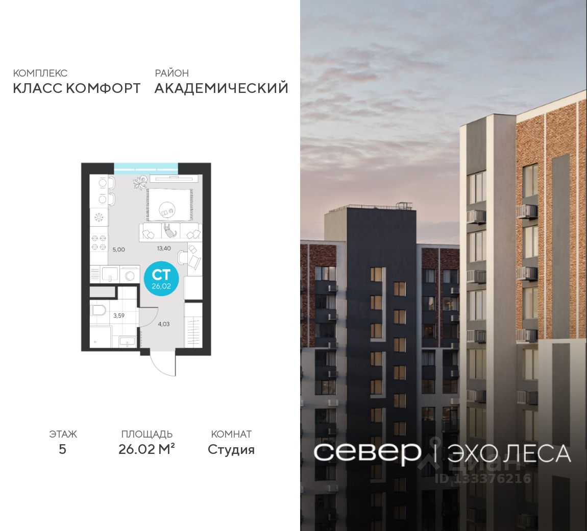 Продаётся квартира площадью 26.02 м2 в жилом комплексе ''Эхо леса''. Квартира находится на 5 этаже, жилая площадь квартиры 13.4 м2, площадь кухни-ниши — 5 м2.