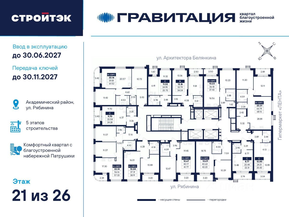 Удачные решения Новый квартал благоустроенной жизни ''Гравитация'' мы разместили в периметре улиц Рябинина и Академика Ландау. У квартала 5 этапов строительства, а всю работу мы завершим к 2030 году. Авторы проекта гармонично совместили в оформлении природные элементы и современный дизайн. Волнообразные очертания на стенах вдохновлены силой ветра и движением воды. Скруглённые углы подчеркивают элегантный силуэт, а контрастная палитра акцентов и контурная подсветка верхних этажей создают выразительный архитектурный образ. Первый этап строительства: — Секция 1.1 — 1 подъезд 26 этажей — Секция 1.2 — 2 подъезда 16 этажей — Секция 1.3 — 1 подъезд 12 этажей Здесь всё и сразу Гравитация — уютный и обособленный, и в то же время открытый и просторный квартал. Всё рядом: супермаркеты и парки, кино и рестораны, школы и сады. В нескольких шагах набережная реки Патрушихи. В квартале построят муниципальный детский сад на 200 мест, а на 5 этапе строительства мы возведём 6-уровневый надземный паркинг на 250 машин. На первых этажах домов для вас будет работать торговая галерея с магазинами, кафе и привычными бытовыми сервисами. В 1 этапе строительства 631 квартира. Своя вселенная Развитый Академический район удобен и молодым семьям, и школьникам, и состоявшимся профессионалам. Рядом большой Преображенский парк с озером и Юго-Западный лесопарк с Тропой здоровья. — 3 минуты до Гипер Ленты — 10 минут на машине до ТРЦ ''Академический'', 15 минут до ЕКАД, 25 до центра — 6 школ и 6 детских садов — Спортивные комплексы и клубы Wake up, Bright Fit и Юность Богатые возможности В квартале два просторных закрытых двора общей площадью 1,4 гектара. Один двор объединяет 1 и 2 этапы строительства, другой — 3, 4 и 5 этапы. Между дворами — камерная прогулочная аллея для неспешных вечеров или полуденного отдыха. Во дворе первого этапа — зелёные участки из хвойных деревьев, акцентных кустарников и травянистых многолетников, а также сеть дорожек, детская площадка с песочницей, аттракционами и геопластикой, настольный теннис и зона для зарядки. А для комфорта и безопасности — вечернее освещение, охрана и постоянное видеонаблюдение. Пространство с заботой В просторных светлых лобби Гравитации — интеллигентный дизайн, помещения для колясок, высокие витражи и комфортная мебель. Выходы сквозные, на улицу и во двор. Лифты грузоподъёмностью 1000 и 450 кг. Мы подготовили для вас 44 уникальных варианта продуманных планировок, в том числе с кухнями-гостиными, гардеробными и мастер-спальнями. Здесь нет бесполезных зон, зато есть где посидеть в семейном кругу и разместить всё для удобства и комфорта. Современные технологии Мы позаботились о достойной чистовой отделке, чтобы вы могли уделить время главному. — Виниловые обои на флизелиновой основе, окрашенные стены в санузлах и на лоджиях — Натяжные потолки везде, кроме лоджий, там — окрашенные — Прочный влагостойкий ламинат и керамическая плитка — Межкомнатные двери светлых тонов и сейф-дверь на входе — Эргономичное размещение розеток и выключателей