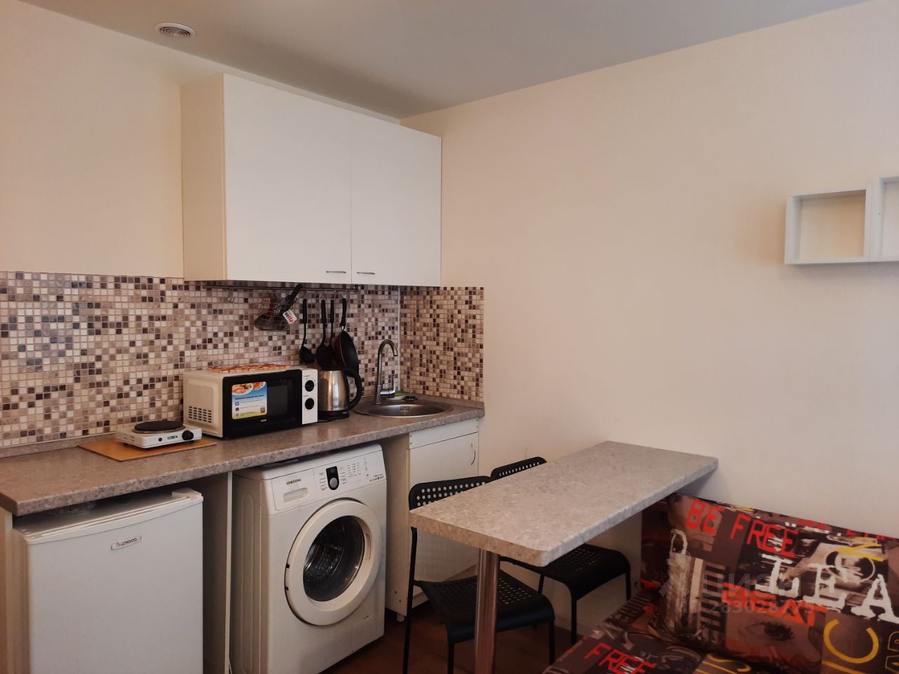 Есть всё для комфортного проживания, всё новое: холодильник с морозильной камерой, стиральная машина, микроволновая печь, чайник, посуда, столовые приборы, сушилка для белья